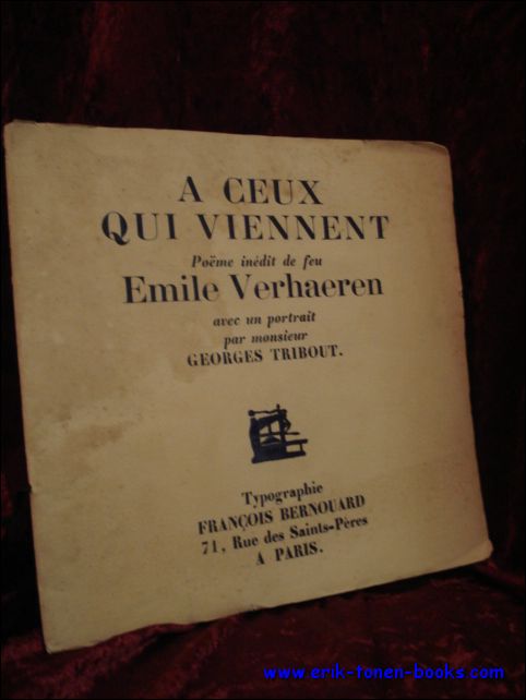 VERHAEREN, Emile. A CEUX QUI VIENNENT. POEME INEDIT DE FEU. AVEC UN PORTRAIT PAR MONSIEUR GEORGES TRIBOUT. Paris, Bernouard Typographie, 1920. Broche, couverture papier tenue par un ribon, page de titre ai vignette, frontispice ( portrait ), 230 x 225mm., pages ne sont pas coupees. Illustrateur : portrait : G. Tribout Edition numerotee dans une edition de 508. Couverture est un peu salie. Référence: 2267 | Prix: EUR 35.00 Ajouter au panier